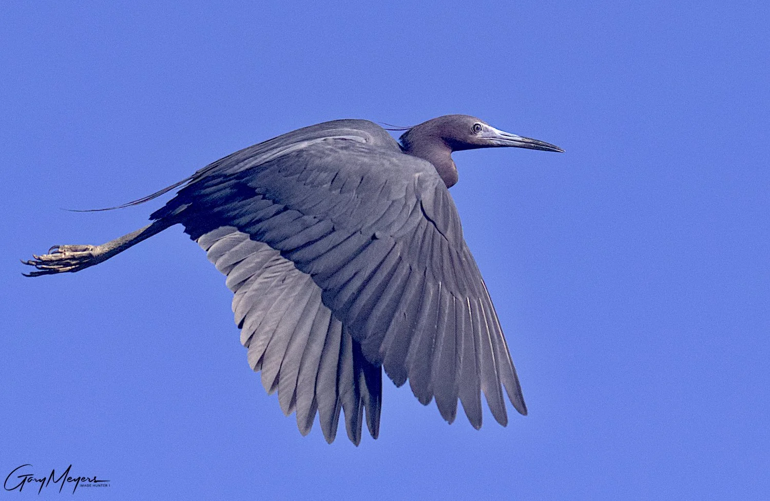 When breeding, Little Blue Herons take on rich wine-colored feathers on their heads and necks. This is in contrast to their naturally beautiful slate-blue bodies. Young Little Blue Herons are totally white in color, which often confuses observers. Even with young white feathers, they keep a dark-tipped pale-blue bill and greenish legs, for which they are known. In flight, they have a relatively slow and easy-going wingbeat – much the same as the similarly sized Snowy Egret.